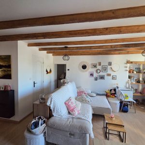 Dès l'entrée, un dégagement vous accueille, s'ouvrant sur un spacieux salon/séjour baigné de lumière, sublimé par de magnifiques poutres apparentes qui confèrent un charme indéniable à l'ensemble. La cuisine aménagée et équipée s'ouvre sur cet espace, créant un lieu de partage parfait pour vos moments en famille ou entre amis.
