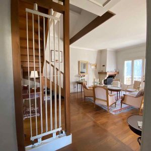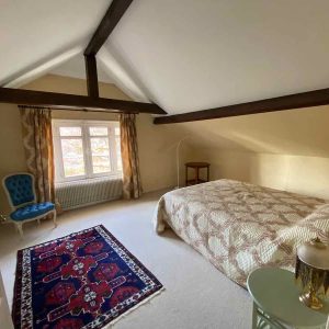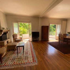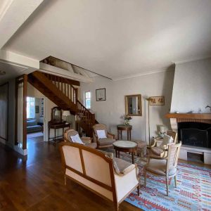 Un salon/séjour spacieux avec cheminée, donnant accès à la terrasse exposée plein sud, une cuisine aménagée, une salle de bain et un wc indépendant.