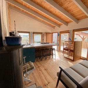 Cuisine ouverte sur pièce de vie avec poêle à bois, une cha ...