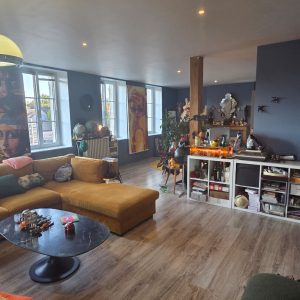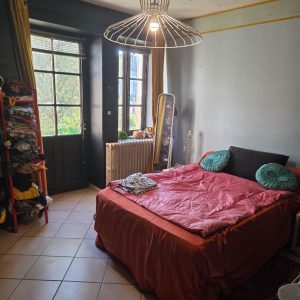 A l'étage, une grande pièce de vie baignée de lumière bénéficiant d'une double exposition (Sud et Ouest) pouvant servir de salon, bibliothèque... Une salle d'eau avec WC, deux chambres (entre 17 et 18m2).