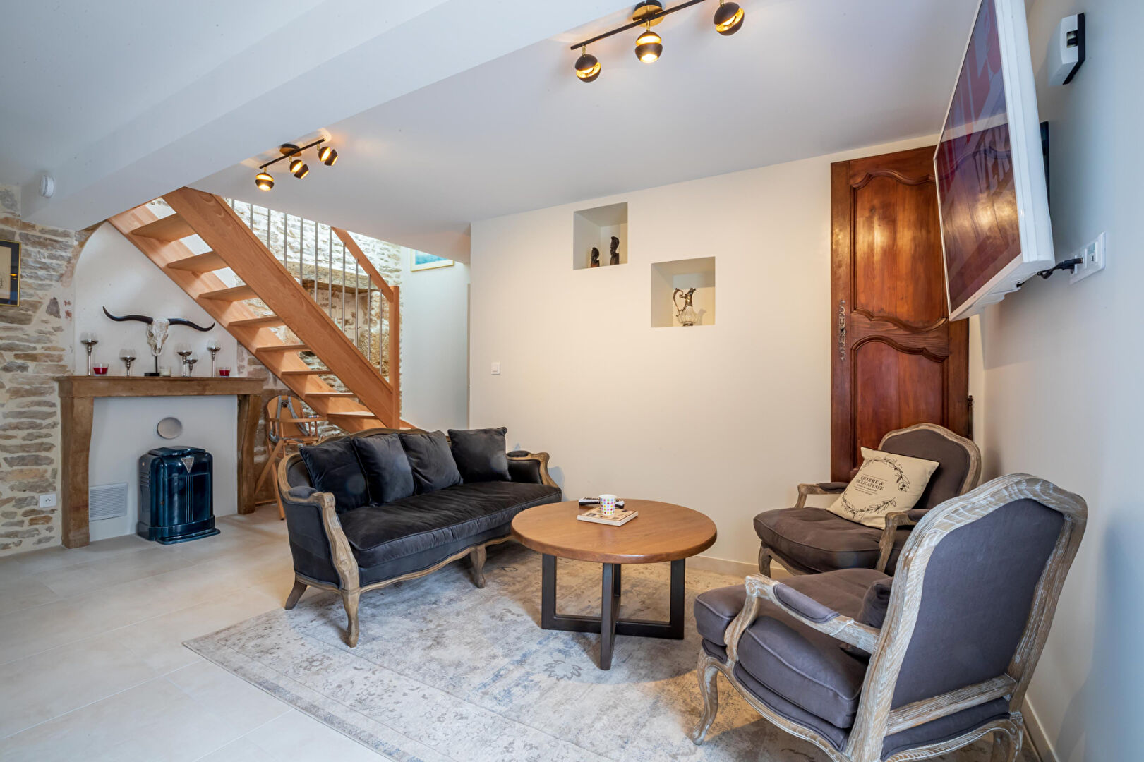 Cuisine ouverte sur pièce de vie avec poêle à bois, une cha ...